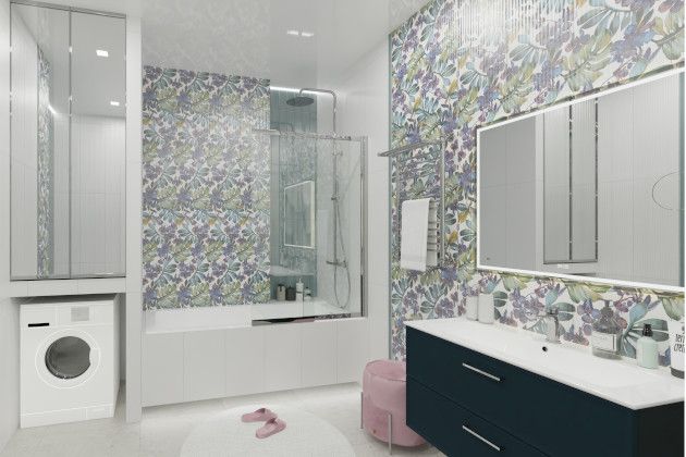Сердцем интерьера и центром притяжения внимания становятся стены, облицованные цветочным декором Бела-Виста. Матовая плитка 30х90 с флористическим рисунком в пастельных тонах превращает обычную ванную комнату в прекрасный оазис. Листья монстеры и цветки орхидеи создают весеннее настроение круглый год.