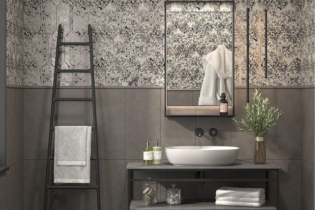 Пол - Про Чементо - как бы плавно перетекает в стену - Чементо. Однотонная фоновая плита с эстетикой бетона в спокойных природных оттенках успокаивает глаз и создает хороший фон для яркого и смелого акцента с плиткой Каламита. Декоры Каламита оригинальной формы "конфета" сочетают эстетику бетона и дамасские узоры. Рисунок нанесен металлизированным составом с содержанием платины.