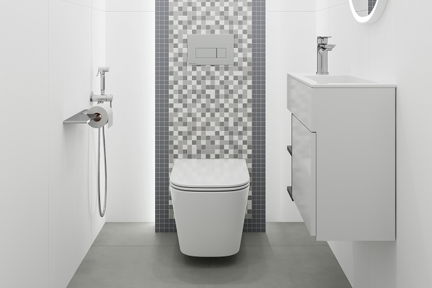 Стены облицованы однотонной белой керамической плиткой Танжер с гладкой поверхностью — она не только эстетически привлекательна, но и практична в уходе. За унитазом стена выделена с помощью мозаичного микса Темари. Сочетание чипов разных оттенков серого и белого привлекает внимание и добавляет интерьеру индивидуальности. Мозаика создаёт интересный визуальный эффект и становится своеобразной изюминкой санузла.